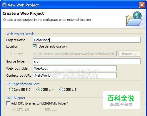 Step 2: 在Project Name字段中输入HelloWorld Project Name字段中输入HelloWorld,其他项目使用默认的设置,然后点击完成按钮,请参考下图: