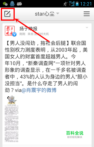 运行新浪微博客户端,点击首页左上角的发布按钮。