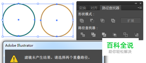 在Ai中两个路径在路径查找器中做交集操作时提示:“滤镜未产生结果,请选择两个重叠路径”,主要有以下三种原因。