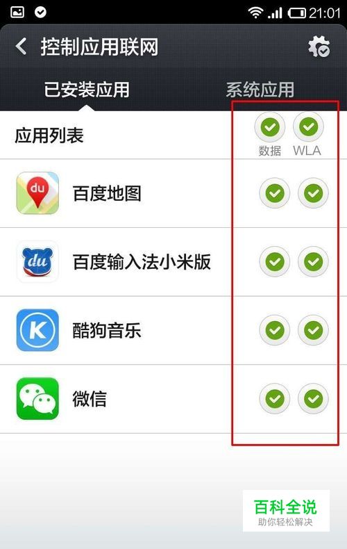 只有把想要联网的软件后面的的叉号改变成为对号,那么就可以联网上网啦。点击上面的数据或者是WLA,那么全部的相对应的软件都就可以上网啦。