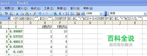 E2输入 =IF(AND($B2<>"",$C2<>""),COUNTIF($B:$B,"<"&B2)+(1+COUNTIF($B:$B,"="&B2))/2,"") E3输入 =IF(AND($B3<>"",$C3<>""),COUNTIF($B:$B,"<"&B3)+(1+COUNTIF($B:$B,"="&B3))/2,"") 下拉到E11 F2输入 =IF(AND($B2<>"",$C2<>""),COUNTIF($C:$C,"<"&C2)+(1+COUNTIF($C:$C,"="&C2))/2,"") F3输入 =IF(AND($B3<>"",$C3<>""),COUNTIF($C:$C,"<"&C3)+(1+COUNTIF($C:$C,"="&C3))/2,"")