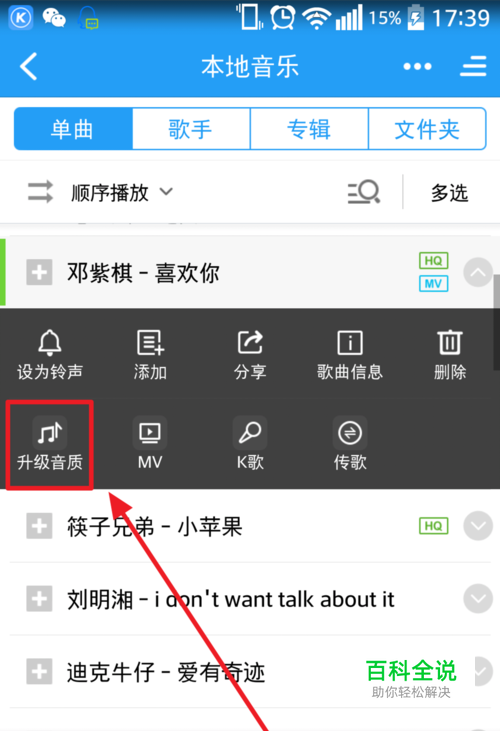 选择一个首你要升级音质的本地音乐。在下拉菜单中,选择升级音质。