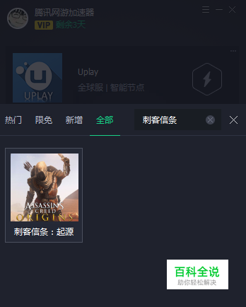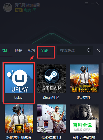 在弹出的游戏选择页面上,点击“全部”选项,可以看到第一个就是Uplay。或者也可以在搜索框输入“Uplay”进行查找。