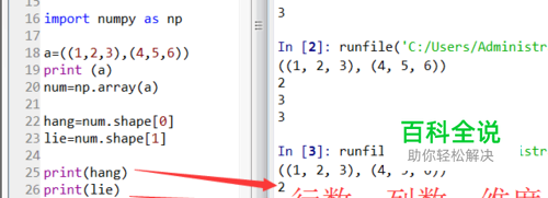 然后用shape判断行和列数,具体用法见图1,需要用第三方numpy库,在数组后,加shape,可以得到一个两元素数组,第一个即为行数,另一个则是列。