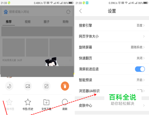 手机浏览器UA标识设置成电脑模式。 手机上面打开浏览器,点击手机上面的菜单键,或者点击手机浏览器上面的菜单功能图标,然后点击【设置】,将“浏览器UA标识”设置成“电脑”。(类似于电脑浏览器上面登录无线路由器)