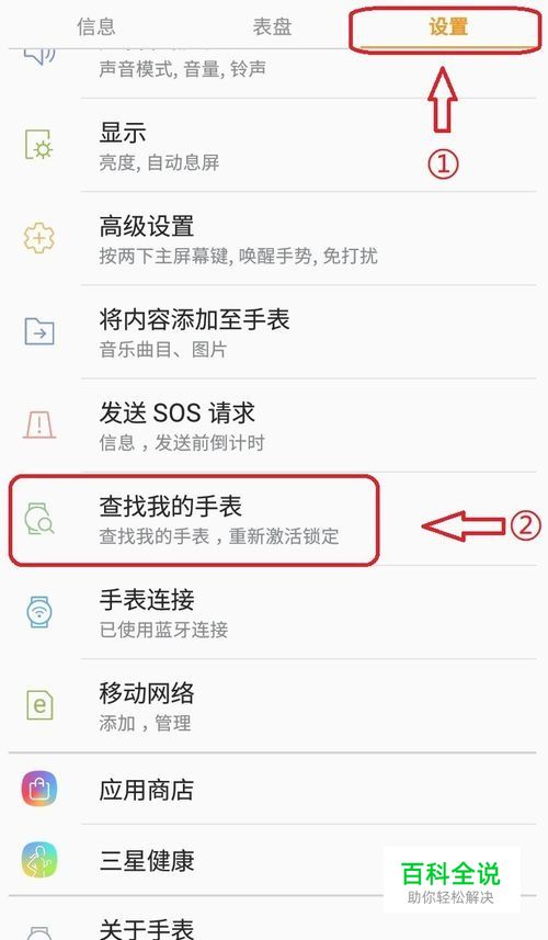 当手表还能够连接到手机上的GalaxyWearable时,可以使用GalaxyWearable的相关设置来重置你的手表。 ↓↓↓步骤如下: >在手机上打开三星「Galaxy Wearable」应用,点击设置选项卡,选择「查找我的手表」选项