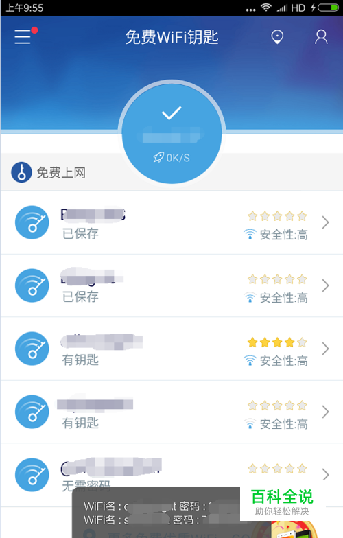 然后你只需要打开应用,下拉刷新一下,你就可以看到周围能够查到密码的wifi的名字和密码,尽情的连接吧。