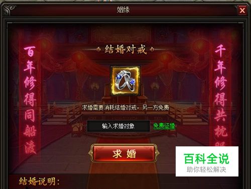 一个人闯荡乱世是不是觉得孤单呢?在皇图中,也可以和心仪的他(她)成为夫妻,牵手一生了哦。玩家在游戏中,点击游戏主界面中的【角色】按钮,再点击角色功能面板里的姻缘功能,即可向心仪的TA求婚。 在皇图中,促成一段姻缘的除了双方的感情外,需要满足的条件还是有的哦。结缘条件如下: 1、双方为同一国家,且双方等级均需达到100级; 2、双方都为单身,性别为1男1女; 3、求婚需要花费520元宝购买结婚对戒,结婚后双方均可获得挚爱戒指; 4、结婚后夫妻双方可享受免费互相传送功能。 达成所需条件后,皇图玩家可在求婚界面中输入求婚对象的角色名,也可选择免费征婚(对同一个人求婚CD时间需要5分钟,免费征婚CD时间也为5分钟)。如果爱人昵称太复杂的话,可左键点击玩家名字,选择复制角色名,然后再粘贴到输入框中。 输入名字正确且拥有结婚对戒的玩家即可发起求婚,成功发起求婚后,对方会收到求婚信息。在皇图里,“观众们”是可以对成功结缘的新人进行祝福的。 在皇图中,如果对方接受求婚,其他玩家会收到消息,点击“喜”字按钮,选择要祝福的新人,可以送上自己的祝福。祝福分为2种,分别是赠送龙凤镯和永恒钻戒。 皇图龙凤镯需要388礼金可赠送,赠送后可获得3份新人的赠礼,开启后可获得道具奖励;皇图永恒钻戒需要188元宝可赠送,赠送后可获得10份新人的赠礼和888礼金。而被祝福的新人可获得姻缘值和魅力值的奖励。 姻缘值可用于领取结婚时装,中式结婚时装需要达到520点领取,西式结婚时装需要达到1313点姻缘值领取。 成功结缘后的夫妻可以打开皇图姻缘互动面板进行互动,进行一些亲密的举动,增加魅力值,魅力值可用于提升挚爱戒指,可提升人物战斗力。在姻缘功能面板里的夫妻记事可查看双方的互动情况,以及收到的祝福、送花相关的记录。夫妻互动说明如下: 1.夫妻之间送花可额外获得20%的魅力值加成,好友之间送花也可获得魅力值; 2.牵手,需要消耗200000 非绑定铜钱,可获得5点魅力值,每日可进行5次; 3.拥抱,需要消耗88礼金,可获得10点魅力值,每日可进行5次; 4.亲吻,需要消耗50元宝,可获得50点魅力值,每日可进行10次; 5.传送,夫妻之间每日可免费传送3次,3次后每次需要20元宝传送,传送必须对方在线,某些地图无法进行传送。 据悉,除了夫妻互动外,婚戒也可以进行升级操作,从而增加战斗力。虽然婚姻看似甜蜜,但也有死情缘的时候,在皇图里,因为性格不合等理由也是可以进行【缘分已尽】的洗涤的。所以在答应求婚前,大家最好停下来细想一下哦。