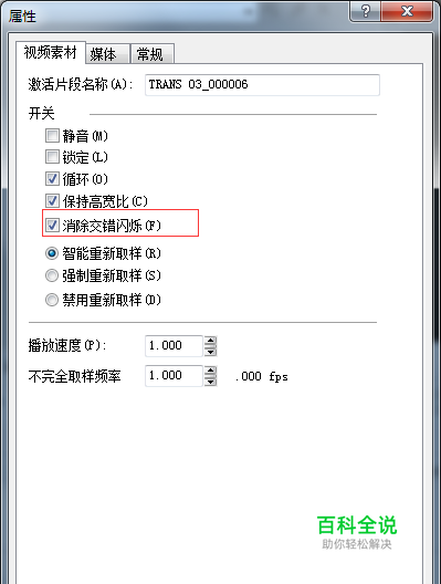 这个属性的窗口是分别对每个视频轨道右键,再选择“属性”而得到的,要分别对每个轨道进行属性设置,设置如上2图,“视频素材”选“消除交错闪烁”、“媒体”选“下场优先”选项。