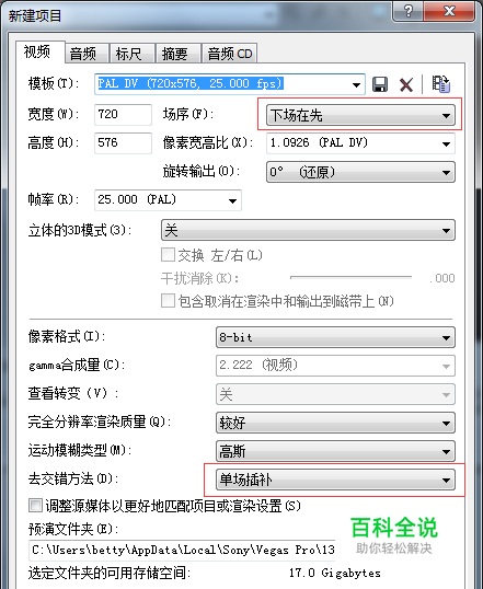 接下来进行防抖动设置,具体操作为:选择菜单中的“文件”--“属性”,就弹出项目属性窗口,在“视频”菜单中,场序选“下场优先”,去交错方法选“单场插补”。