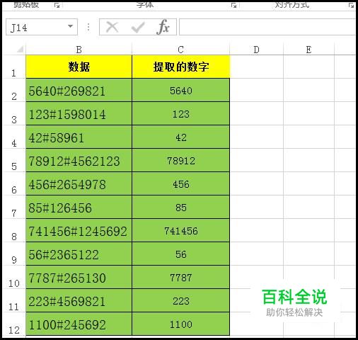 选中C2:C12这区域的单元格;接着,在编辑栏中输入公式:=LEFT(B2,FIND("#",B2)-1),输入公式后,我们再同时按下键盘的:CTRL+ENTER,这两个键。C2:C12即同时显示出提取的数字;这些数字都是B2:B12单元格数据#字符前面的数字。