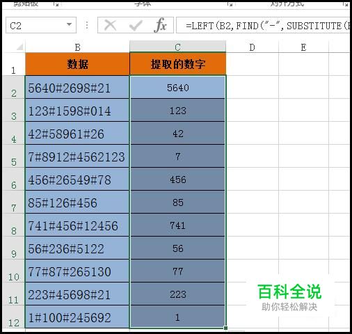 选中C2:C12这区域的单元格;接着,在编辑栏中输入公式:=LEFT(B2,FIND("-",SUBSTITUTE(B2,"#","-",1))-1) 输入公式后,我们再同时按下键盘的:CTRL+ENTER,这两个键。C2:C12即同时显示出提取的数字;这些数字都是B2:B12单元格数据左边第一个#字符前面的数字。