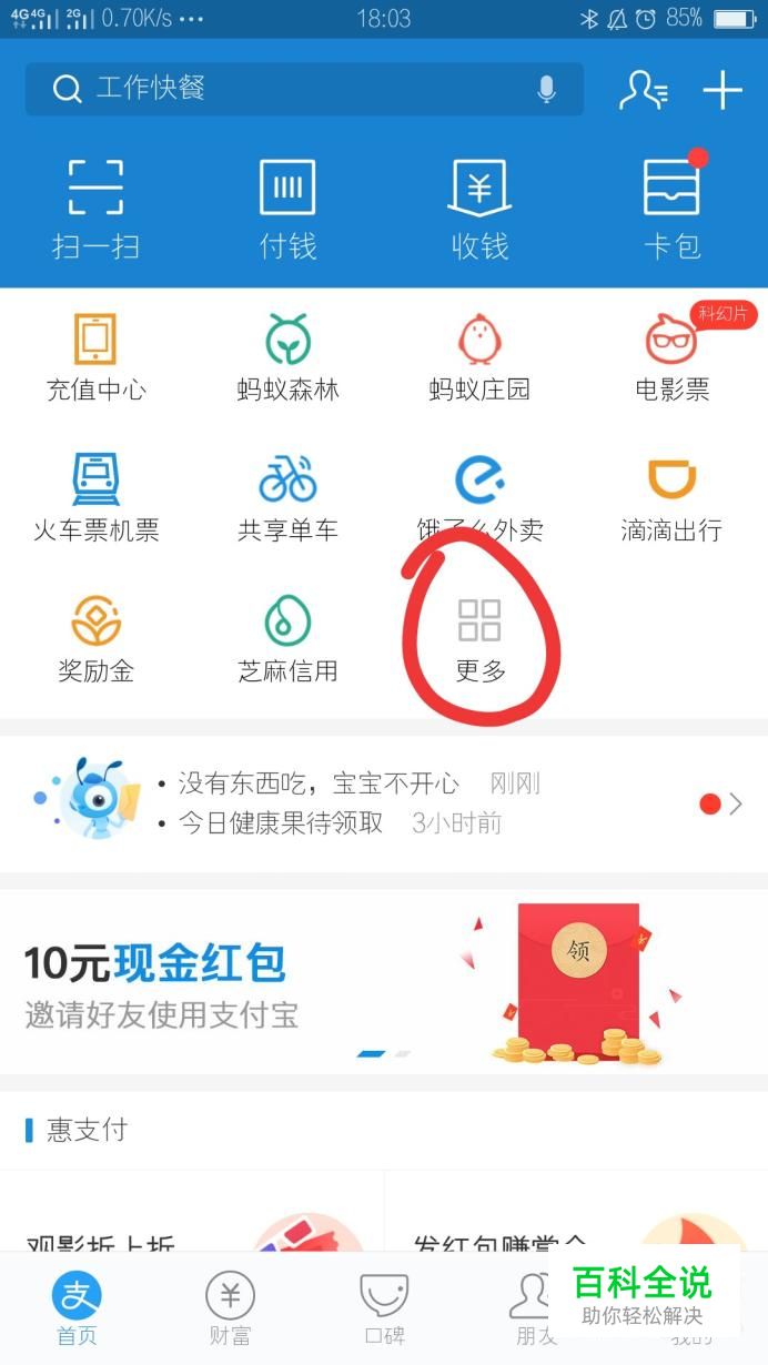 首先需要我们在手机下载支付宝APP,然后登录支付宝之后,在首页面中需要找到“更多”选项,点击进入下一个操作页面。