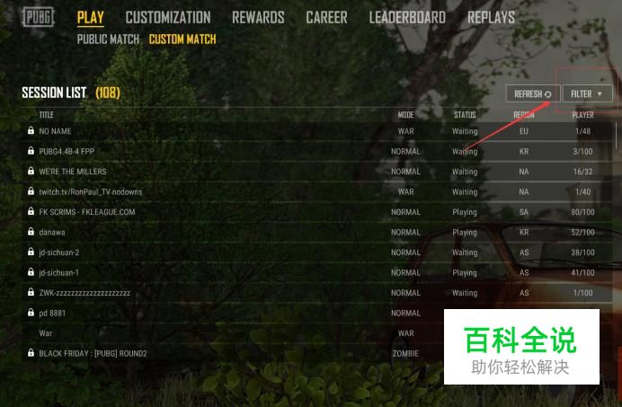 完成设置后我们就能看到有哪些房间可以加入,我们可以加入的是图中标示WAITING的房间,并且还需要知道该房间的密码才行。 以上就是吃鸡怎么玩僵尸模式了。