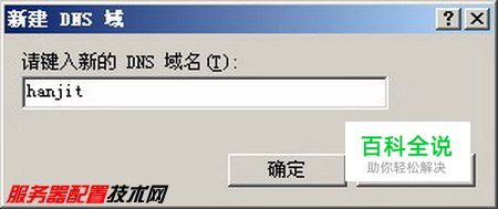 第3步,展开并选中刚才新建的COM区域,在打开的快捷菜单中执行“新建域”命令,打开“新建DNS域”对话框。在该对话框中输入一个合适的域名,如hanjit,并单击“确定”按钮,如图2008121202所示。 图2008121202 输入DNS域名
