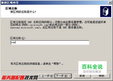 第2步,在“区域类型”选项卡中保持默认选项“主要区域”的选中状态,单击“下一步”按钮。接着在“区域名称”选项卡中输入合适的区域名称,如COM。依次单击“下一步”→“完成”按钮完成设置,如图2008121201所示。 图2008121201 输入区域名称