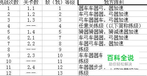 先说亲测第一个主题任务 挑战次数关卡数敌(我)等级我方阵形11.11 器车车器弓,器加速 21.22 车弓车器器,弓器加速 31.33 弓车器器车,弓器加速 4——4任意关练级(以下简称练级)51.45 骑器骑器骑,骑减速器加速 62.17 车弓车器器,弓器加速 72.28 车器弓车器,器加速 8——9练级92.310 车车器器车,器加速 10——11练级112.412 车器器步步,车减速器加速 12——13练级132.514 器车弓车器,器加速,车弓减速 143.116 步步步弓弓,步加速 153.217 步步器器车,步器加速
