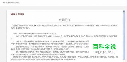 1、首先访问华为官方的解锁网站,会出现下面的图,下拉协议然后选择 我已阅读以上条款并接受所有内容 ,点下一步