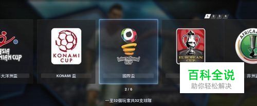 杯赛(Competition)里有六种不同的赛事供玩家选择,其包括了最经典的国际杯与欧洲杯赛外,还有非洲杯与KONAMI杯。