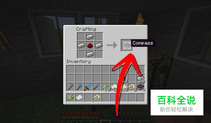 搜集资源,做出地图。 需要一个指南针(4个铁锭+1个红石粉末),如下图做出。 需要8张纸(如图用甘蔗做出)