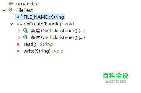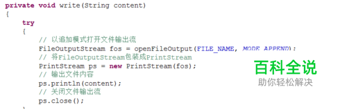 write(String content)写入方法 private void write(String content) { try { // 以追加模式打开文件输出流 FileOutputStream fos = openFileOutput(FILE_NAME, MODE_APPEND); // 将FileOutputStream包装成PrintStream PrintStream ps = new PrintStream(fos); // 输出文件内容 ps.println(content); // 关闭文件输出流 ps.close(); } catch (Exception e) { e.printStackTrace(); } }
