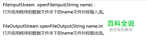 FileInputStream openFileInput(String name): 打开应用程序的数据文件夹下的name文件对应输入流。 FileOutputStream openFileOutput(String name,int mode): 打开应用程序的数据文件夹下的name文件对应输出流。