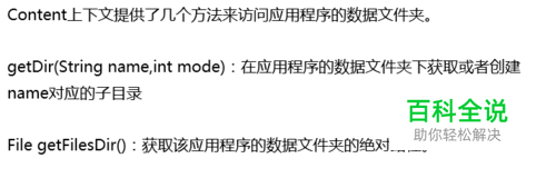 Content上下文提供了几个方法来访问应用程序的数据文件夹。 getDir(String name,int mode):在应用程序的数据文件夹下获取或者创建 name对应的子目录 File getFilesDir():获取该应用程序的数据文件夹的绝对路径。 String[] fileList():返回该应用程序的数据文件夹下的全部文件。 deleteFile(String):删除该应用程序的数据文件夹下的指定文件。