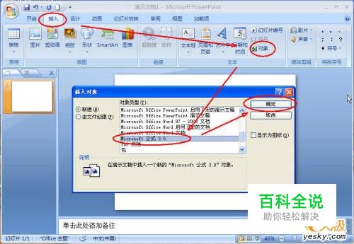 如(图一)点击“插入”选项卡“功能区”上的“对象”工具,在弹出的“插入对象”界面点击“microsoft公式3.0”然后点击“确定”在公式编辑器中编辑好公式,(以图二中的公式为例)在编辑好的公式上点击右键,在弹出的菜单上点击“另存为图片”把我们编辑的公式存为图片。注意:图片保存类型要选择“PNG可移植网格图形格式(*.PNG)(值得一提的是在PowerPoint2003中类似的我们只要在弹出的菜单点出“设置对象格式”在“设置对象格式”界面“图片”选项卡下点击“重新着色”按钮就可以为公式设定想要的颜色了,在PowerPoint2007中这一招不灵了,这也是写本文的意义之所在)