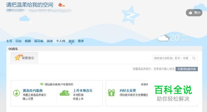 大家都知道QQ空间里想要有背景音乐的话需要开通绿钻特权,其实也可以通过自己添加音乐的外链地址来免费获得背景音乐,下面就来教一下怎么弄吧。