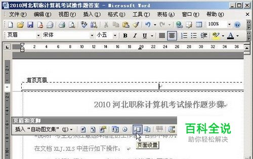 第2步,进入页眉和页脚编辑状态,在自动打开的“页眉和页脚”工具栏中单击“页面设置”按钮,如图2010060806所示。 图2010060806单击“页面设置”按钮
