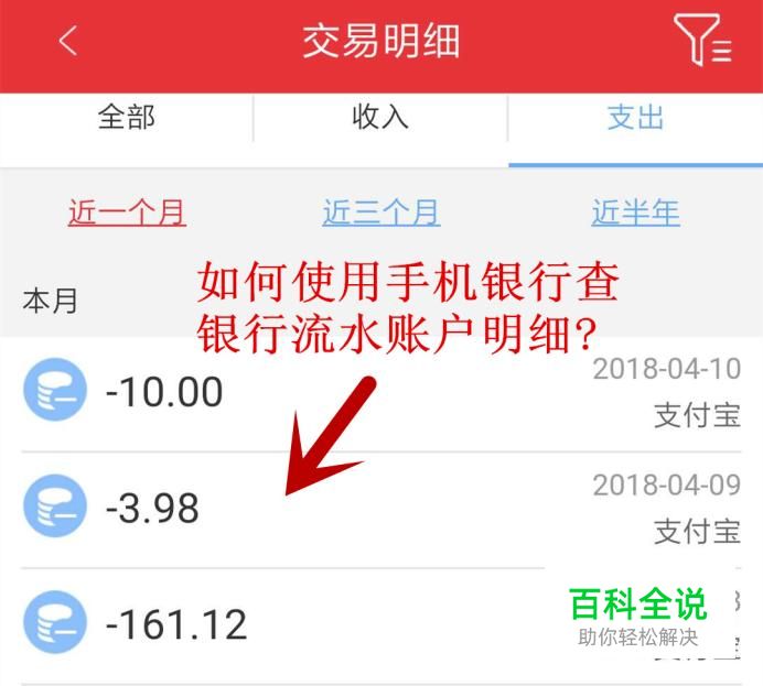 银行卡帐户的银行流水账户明细即列出来,我们可选择近一个月、近三个月、近半年的帐户明细,还可选择收入、支出的明细,也可选择不同的帐户、币种。