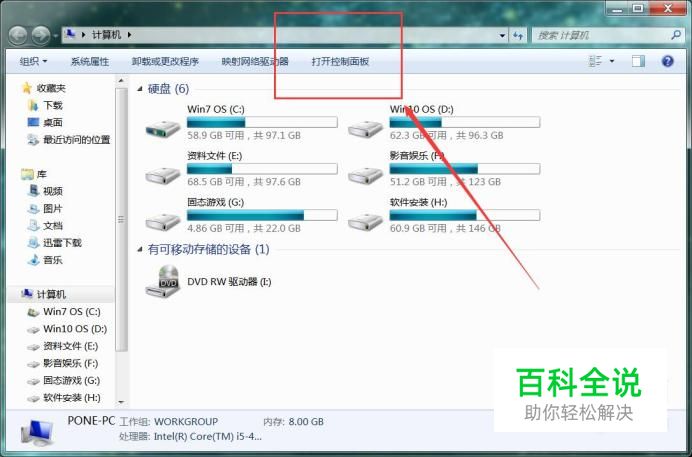 打开系统中的计算机应用窗口,点击窗口主页面中的“打开控制面板”菜单选项。