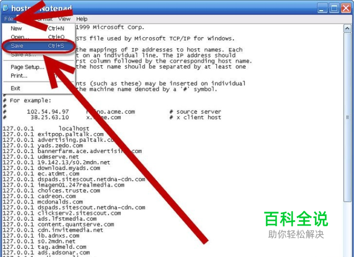 用记事本打开host文件之后,将上面输出的所有内容复制粘贴到最后一行"local host"的下面。