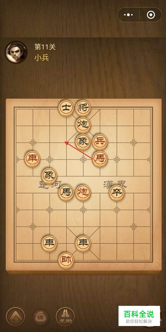 第十一关,先跳马将军,敌方将会挪到右边一步,接下来,兵乘胜追击,你的兵会被吃掉,然后用车去将军,这样就绝杀通关了,详情如图。