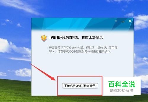 QQ账号被冻结了,会出现如图所示的QQ帐号被冻结、暂时无法登录的对话框,在这里我们点击对话框下面的“了解冻结详情并恢复使用”按钮
