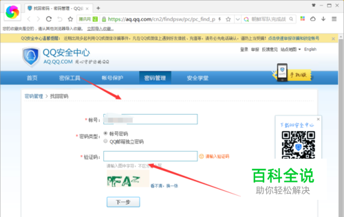 出来你的找回密码,如果你绑定了QQ安全中心,可以拿手机扫一扫,修改新的密码,如果你绑定了手机号码,你可以打上发送验证码,大上那个正确的验证码,就可以改密码了,如果你绑定了密保,你可以打上你的密保修改密码,如果盗你号的那个人修改了这些东西,那你就要去申诉了。申诉请看下个。