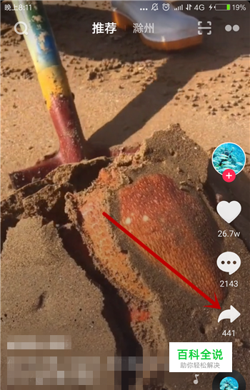 打开抖音后找到并播放想要转发的视频,然后点击右边的【转发】。