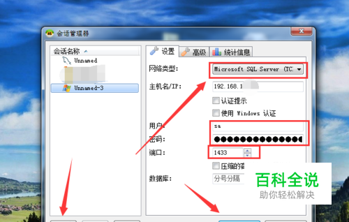 首先我们打开heidisql客户端,我们新建一个连接,如果连接的是sql server的数据库,要选择数据库的类型,端口号一般是1433如果是mysql的数据库,一般端口是3306,记住,别混了,输入用户名跟密码就能链接了。