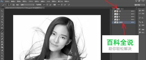 可以看到周围有些灰色的头发,现在我们将灰色的头发也变黑。点击图层上的背景副本的原图,选择画笔工具,吸取头发颜色,点击确定。