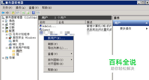 点击 配置--本地用户和组--用户,在右侧空白处右键选择 新用户
