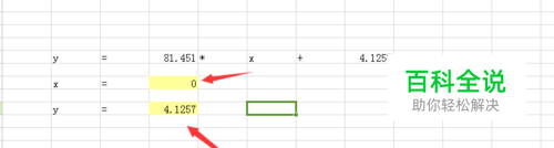 那么如果是已知x求y的化。首先先在"Y="那个黄色的填充格那按一下“=”号。之后鼠标点上“81.541”之后在键盘上按格乘号在点“x=”对应的黄色填充格。在按键盘“+”号。在鼠标点“4.1257”那格。所有的点完了按键盘回车键