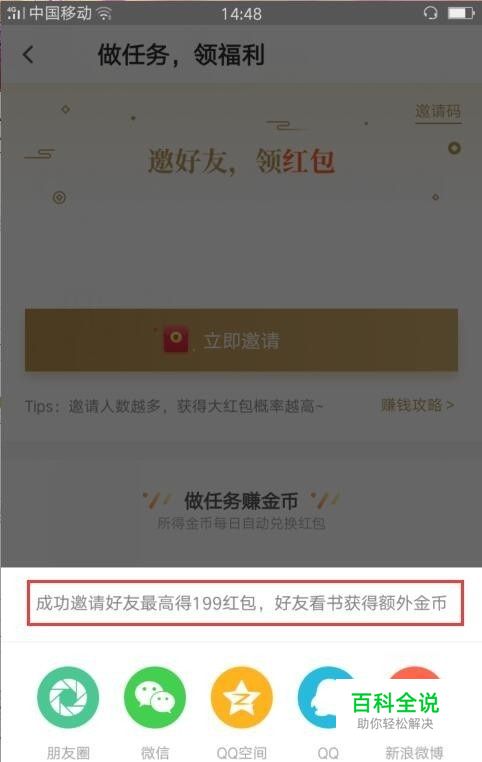 点开红包任务后,就会有一个,邀好友,领红包 任务。你只要点“立即邀请”即可。