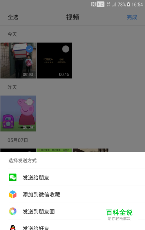 点击视频之后会出现微信里所有保存的视频,我们点击传送,当然还可以,进行移动,或者发送到QQ好友,微信好友,或者朋友圈。