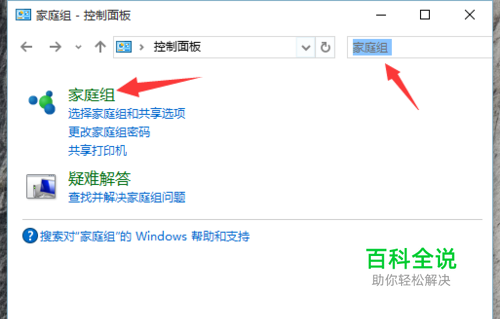 在搜索框中输入“家庭组”然后点击搜索结果,如图: