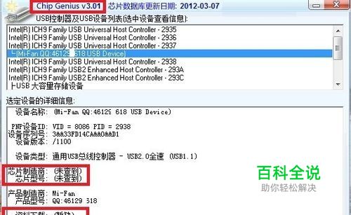 下载后插上U盘,打开“ChipGenius.exe”软件, 通过“芯片型号”或“资料下载”在网上下载对应的量产工具。(注:笔者的U盘因为自行擦除了这些信息,所以显示“未查到”“暂缺”)