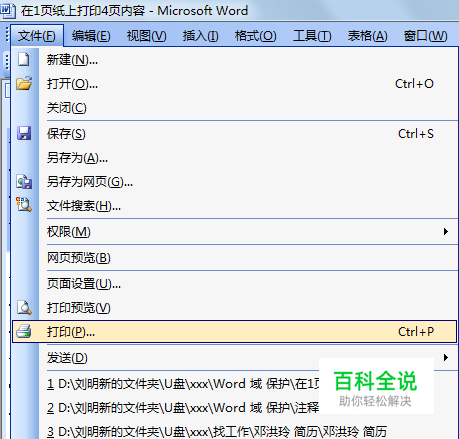 word四页内容打印到一页纸上的方法 2025-06-05 08:17:42 word四页内容打印到一页纸上的方法 操作方法 01 首先在word四页纸上写上内容,随便写 02 打开“文件”-》“打印” 03 打印面板上,修改“每页的版数”为4版 04 那么,四页的内容就会打印的一页纸上 赞 (0) 相关推荐 如何将两页A4纸的Word文档内容打印到一页A3纸上 不论是办公的需要,还是受到条件的限制,针对文档内容的打印,有很多技巧! 本文,我们一起来学习如题所示的技巧! 如果存在两页的A4纸的文档内容,本着为节约资源的利用也好,或受条件的限制(如:办公室刚好没 ... 如何把多页Word文档缩小打印到同一张纸上? 有时候为了减少打印成本或者文档的连续性,我们常常会把好多页的Word文档打印到同一张纸上,这样不仅节约了成本,也让我们在学习和使用打印出来的Word文档时更加的得心用手.那么,如何把多页Word文档缩 ... 把多页的Word文档缩小打印到一张纸上 对许多朋友来说想节约资源,如何把多页的Word文档缩小打印到一张纸上不知从何下手.在这里小编给大家介绍一下. 操作方法 01 首先打开Word文档,点击打开工具栏左上角的打印,点击并确定: 02 进入 ... Word2003将多张内容打印在一张纸上 有的时候进行文档打印,需要把几份内容打印在一张纸上,该怎么办?Word就能帮我们实现,不仅完成了一纸多印,而且节约了纸张,何乐不为?下面我就以把4份文档打印在1张纸上,为大家进行演示. 操作方法 01 ... 如何将excel中被分成两页的内容打印在一张纸上 在使用excel日常办公时,我们输出的时候经常会碰到打印出来的表格总是一半的,下面为介绍下如何运用分页视图功能将表格完整的打印出来. 操作方法 01 打开一个新的excel文档 02 输入表格中的内容 ... 把多页Word文档缩小打印到同一张纸上 在Word中,有时我们需要把已经做好的一份多页文档缩到一页中一起打印,即在一页中显示出多页的内容,应该怎么办呢? 我们可以用调整打印选项的方法来处理.下面我们以一份四页的文档(见下图)为例来说明. 步 ... 如何将Excel表格中多页内容打印在一页纸上 在Excel中,有几页A4纸内容,为了不想浪费纸,想全部打印在一张纸,该如何做呢? 我下面就来分享一下我的 操作方法 01 将多页内容全部打印到一页纸内,方法有好几种. 第一种方法:你可以将字体全部缩 ... Excel 2010 如何设置多页合并打印到一张纸上 如下图,这篇分享是讲Excel 2010 如何设置把多不在同一页的内容打在同一张纸上的设置步骤. 操作方法 01 打开需要打印的Excel文档,然后单击"文件--打印",如图: 0 ... 利用PowerPoint2003将多页图片打印在一张纸上 ①打开幻灯片,单击文件--另存为选项。 ②将保存类型选为JPEG文件交换格式,设置保存文件名称以及路径,保存。 ③弹出对话框,选择第一项,每张幻灯片。 ④系统提示你会以独立文件方式保存,单击确定。 ⑤ ...