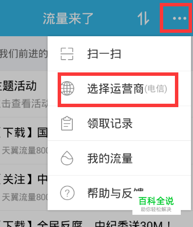 第二步:然后在右上角选择靠右的图标,进入后选择第二项“选择运营商”,根据你手机卡选择相对应的运营商。