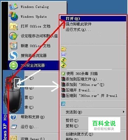 点击电脑桌面左下角的开始功能按钮,在开始功能菜单中,用鼠标右键点击360安全浏览器,再用鼠标左键点击右键下拉菜单中打开功能按钮。