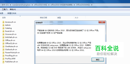 本分享给大家在安装64位office时提示“不能安装64位版本的office,因为您已经安装了32位office产品”时,按照网上说法查看了系统属性确实为64位Windows系统且卸载了32位office后继续安装64位office时还是提示提示“不能安装64位版本的office,因为您已经安装了32位office产品”的解决方法。