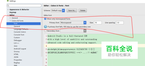 点击Editor>Colors & Fonts >Font 便可进入设置界面,其中Size表示字体的大小值,Line spacing 表示字体行间距。